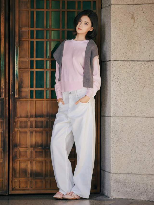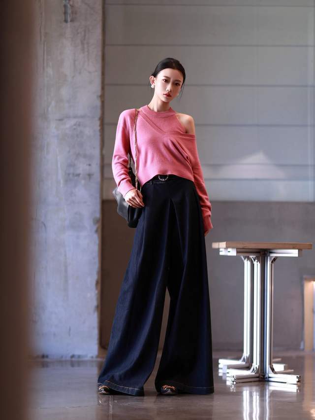 第一章节:何如穿毛衣和阔腿裤能开脱路东谈主感?Tips①:粉色毛衣+白色牛仔阔腿裤