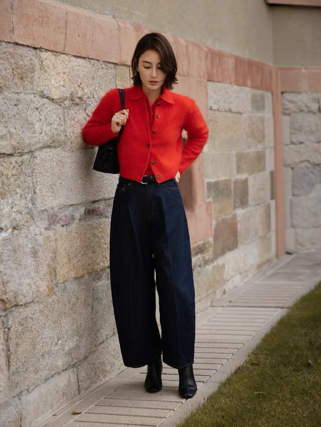 当你上半身弃取的是一件红色的毛衣或者是彩色系的毛衣,就不要弃取亮色的裤子、裙子来穿搭了,那样会让举座配色过于秀气,反而会显得俗气。平直一条白色的阔腿裤或者是蓝色的牛仔阔腿裤,就能科罚举座造型的配色。