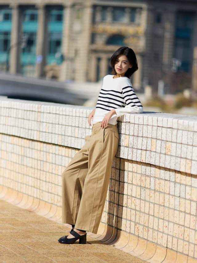 经典的配色永不外时,平直弃取短款的口角条纹诚恳毛衣,搭配上一条卡其色的阔腿九分裤,脚穿玄色的粗跟单鞋,这么上短下长的搭配形式,能使得穿搭者躯壳变成三七分,显高显瘦。