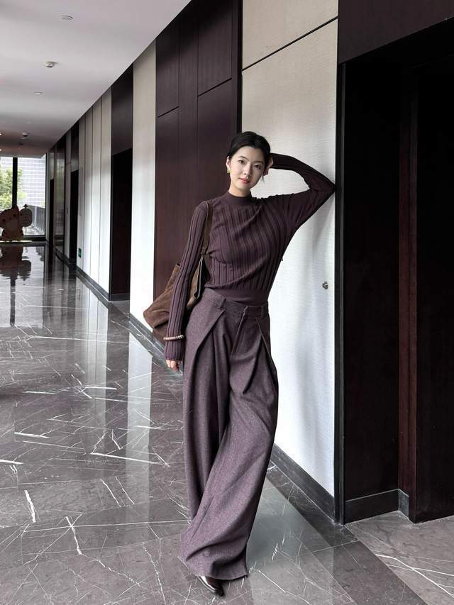倘若思重点亮春日穿搭,不妨弃取一条浅棕色的西装阔腿裤,搭配上棕色的诚恳毛衣,这种穿着色调看起来更显高档。