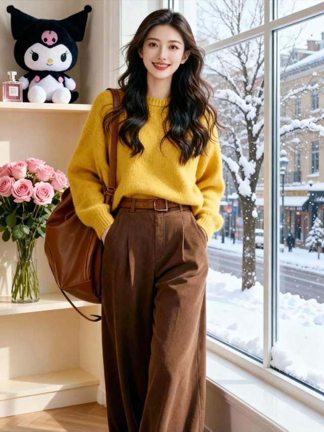 软糯的毛衣裹在身上自带一种和善质感,一条阔腿裤就不错遮住胯宽腿粗等问题,垂坠的利落恶果能让你领有大长腿。