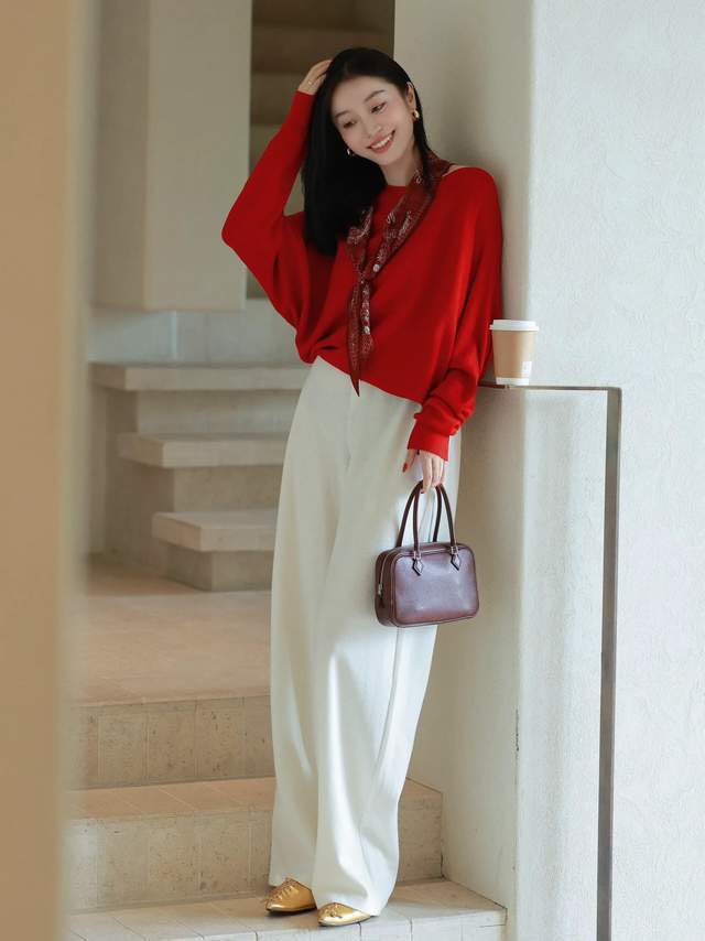 Tips③:红色毛衣搭配白色阔腿裤