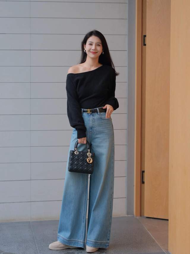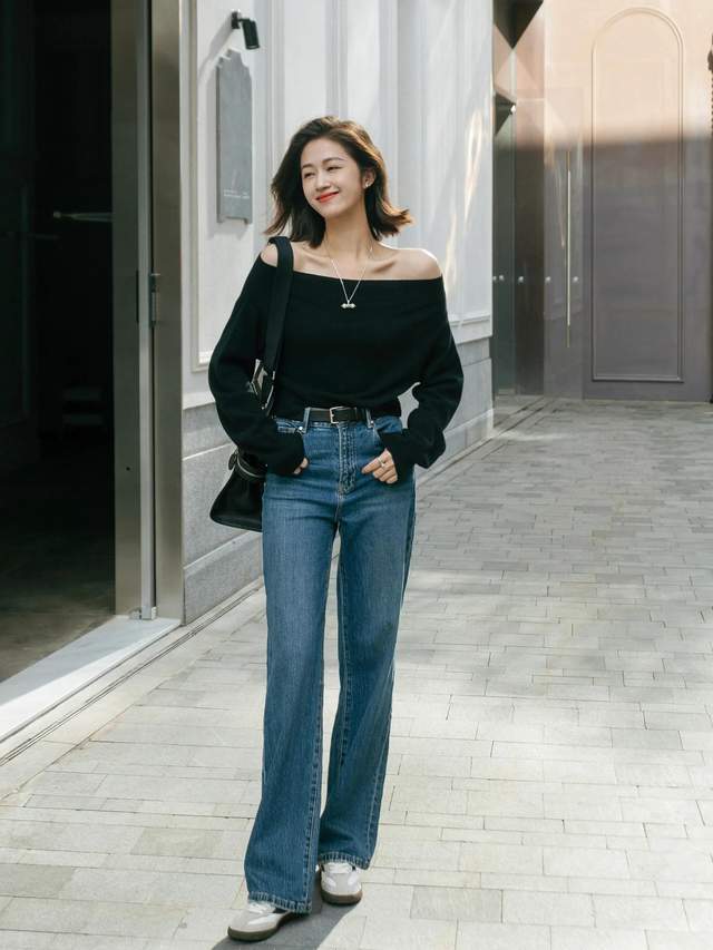 依然投入春季了,当然无用把我方裹得严严密实的,反而咱们不错相宜地显现肌肤。举例上头这位先锋博主,就弃取了玄色的斜肩毛衣搭配上蓝色的牛仔阔腿裤,显现我方的天鹅颈和锁骨,如实会变得愈加迷东谈主颜面。