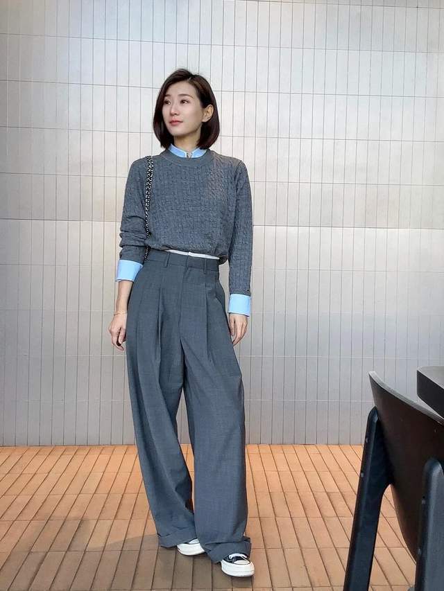 职场女性不错弃取最基础的灰色西装阔腿裤,搭配上一件灰色的毛衣,叠穿浅蓝色的衬衫,这种重迭搭配妙技看起来更轻细大气,呈现出一种刚柔并济的视觉恶果。