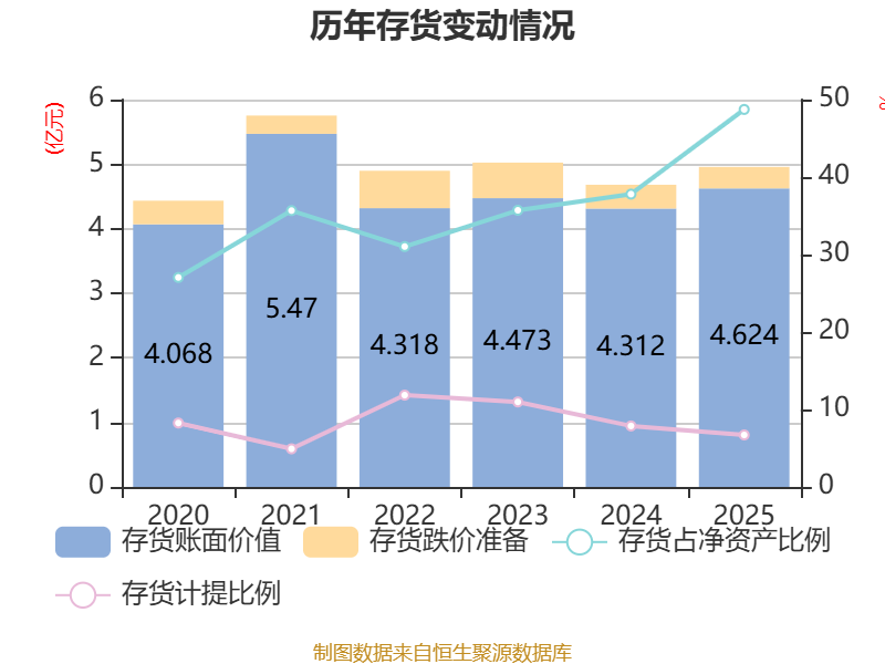 从存货变动来看,阻挡2025年末,公司存货账面价值为4.62亿元,占净财富的48.73%,较上年末增多3113.97万元。其中,存货跌价准备为3327.87万元,计提比例为6.71%。