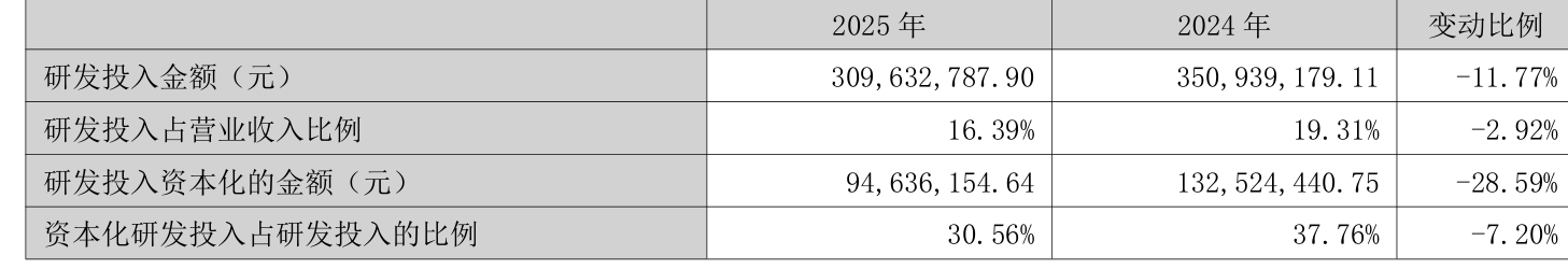 2025年全年,公司研发进入金额为3.1亿元,同比下落11.77%;研发进入占商业收入比例为16.39%,比较上年同时下落2.92个百分点。此外,公司全年研发进入本钱化率为30.56%。