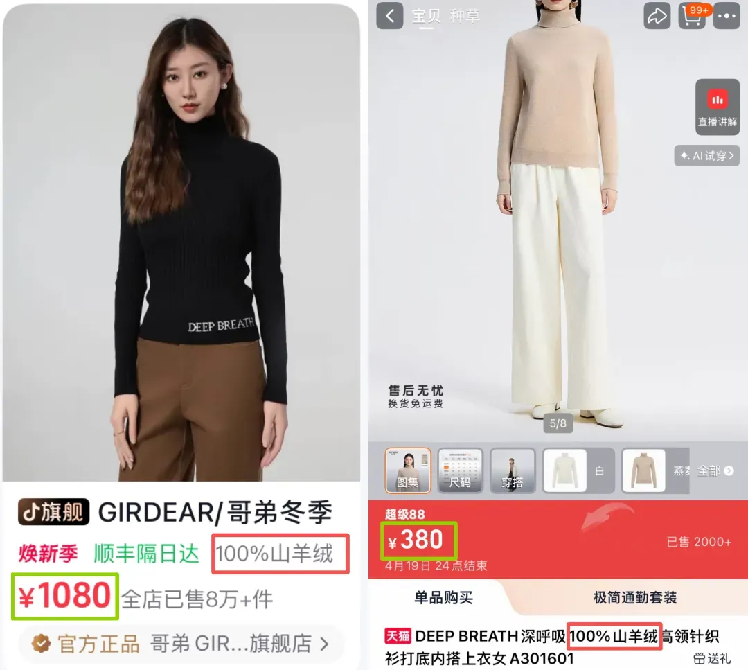 在电商平台上,项目雷同、面料调换的一件100%山羊绒上衣,哥弟卖1080元,深呼吸(原哥弟果然好)只卖380元。
