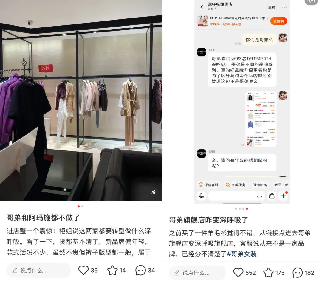更有谨防的虚耗者发现,哥弟自2025年起启用的新吊牌上,偷偷印上了“接续深呼吸”的字样;而另一边,“深呼吸”衣裳的吊牌上也还存在“哥弟果然好”的踪迹。两个品牌剪不停理还乱的关联,让不少老顾主稀里糊涂。