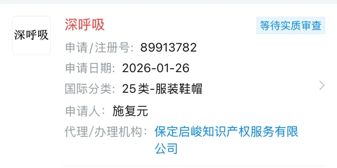 有真义证实防卫到,2026年,哥弟品牌创举东说念主施复元想要拿回“深呼吸”商标,天眼查App自大,其在1月提交了第25类商标肯求,限制4月16日,商标景况仍为恭候骨子审查。