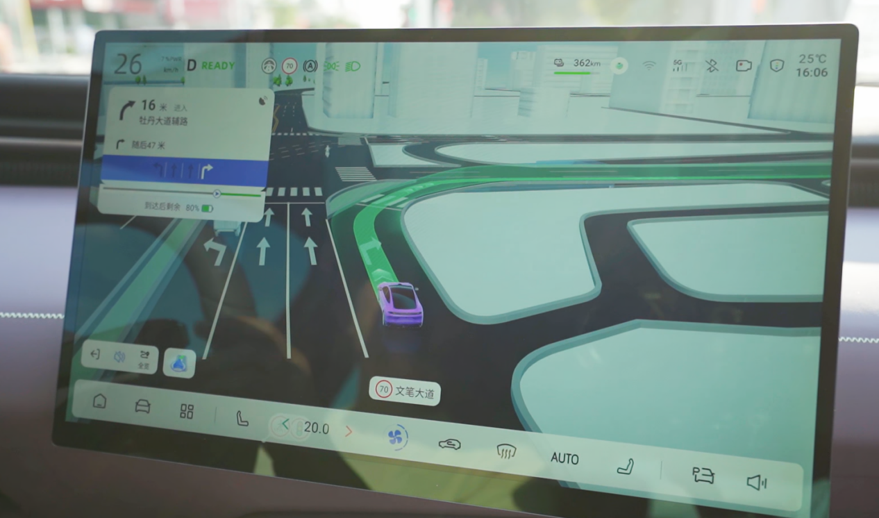 深蓝L06的车谈级导航,完成4个图层的交融,将前进场所、车谈线、红绿灯、车辆行东谈主以及车谈外的绿化建筑王人流知道来,让导航愈加直不雅且有科技感,同级少有。