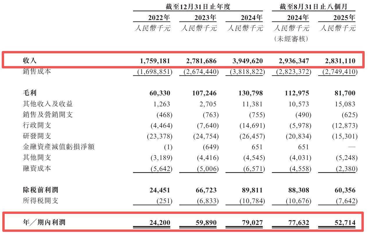 2022年至2024年及2025年前8月(下称“叙述期”),建邦高科折柳已矣营业收入17.59亿元、27.82亿元、39.5亿元和28.31亿元;同时净利润折柳为2420.0万元、5989.0万元、7902.7万元和5271.4万元。